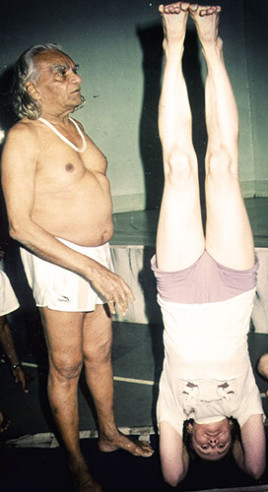 So war ich 2 Jahre später im Intensivkurs im Ramamani Iyengar Memorial Yoga Institute. Iyengars Unterricht war authentisch und von bedingungsloser Hingabe und Begeisterung geprägt. Er verlangte aber auch von uns Schülern dass wir uns bedingungslos auf das Üben einließen. Einmal gab er mir eine Serie von Handstand, Brücke, Tadasana. Ich sollte das 12 mal hintereinander machen. Nach dem zehnten Mal meldete mein Ego, dass es genug sei. Iyengar blieb bei mir stehen und sagte energisch aber gleichzeitig ermunternd: „Two more (noch 2 mal)“. Was ich nicht für möglich hielt, ging dann doch. Ich wiederholte die 3 Asanas noch 2 mal. Statt noch einmal aus der Brücke aufzustehen, blieb ich kurz auf dem Boden liegen. Mit einem strahlenden Lächeln sagte er mir: „This is to be completely purified“ (das ist für die völlige Reinigung – so fühlte ich mich auch danach).